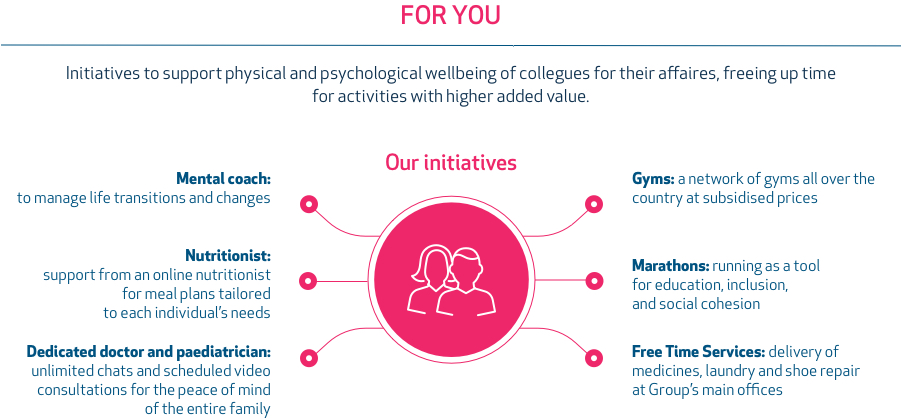 The ‘Smart Welfare’ acts on a supplementary basis, includinginitiatives aimed at facilitating the synergy between personal and professional lives of people to meet the most important needs of colleagues and their families. It is organised into 3 areas: