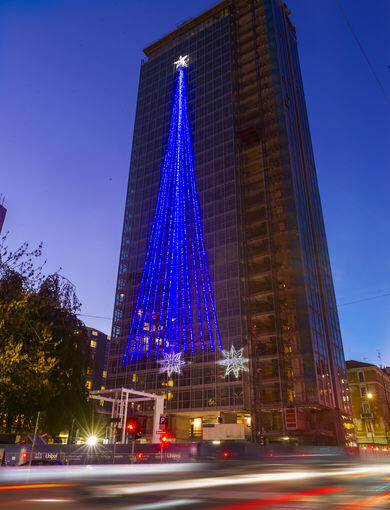 Il 29 novembre si è acceso il Torre GalFa Christmas Tree, l’albero di Natale più alto di Milano grazie all’ installazione luminosa a forma di albero di Natale che è stata posizionata sulla facciata della torre fino all’Epifania. Alla sommità dell’albero, ornato da 13 filari lunghi circa 80 metri l’uno, è stata posta una stella del diametro di 4 metri, composta da 2.000 led.